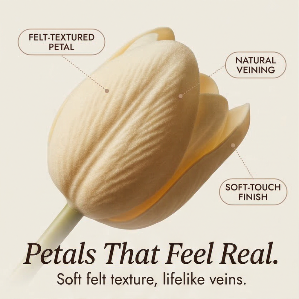 These tulips look fresh months from now — same as the day they arrive. Save the $15-a-week flower habit and keep the beauty year-round.